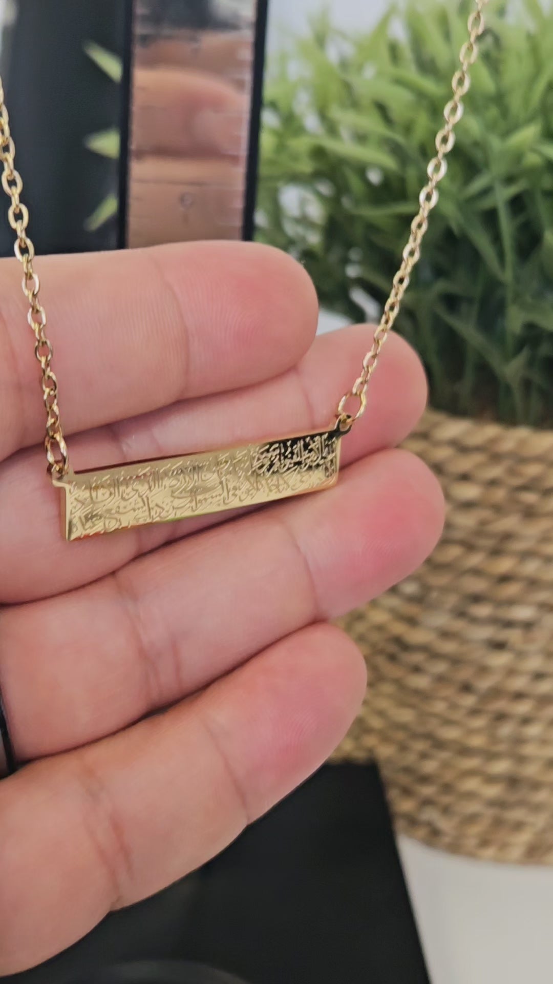 This elegant Ayatul Kursi verse bar necklace features a unique and stylish design that adds a touch of sophistication to any outfit. Made to represent the holy verse, it serves as a constant reminder of faith and protection. Crafted with precision, this necklace is a perfect gift for a loved one. Made of stainless steel.