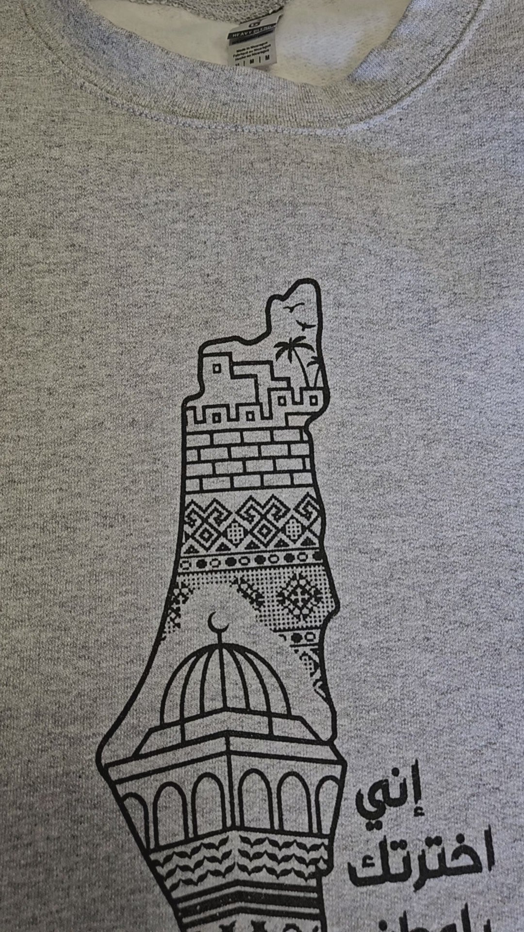 Show your love for Palestine with this thoughtfully designed hoodie. Featuring the shape of Palestine, filled with rich Palestinian-themed details such as Aqsa, Tatreez, and Keffiyeh patterns, this piece is a beautiful tribute to the country’s heritage. The heartfelt phrase, "I chose you, my country, out of love and voluntarily" is written in Arabic, adding depth and meaning to this powerful design. Available in both Adult and Kids sizes with a slightly lighter gray for the kids' version (as shown in the pictures).