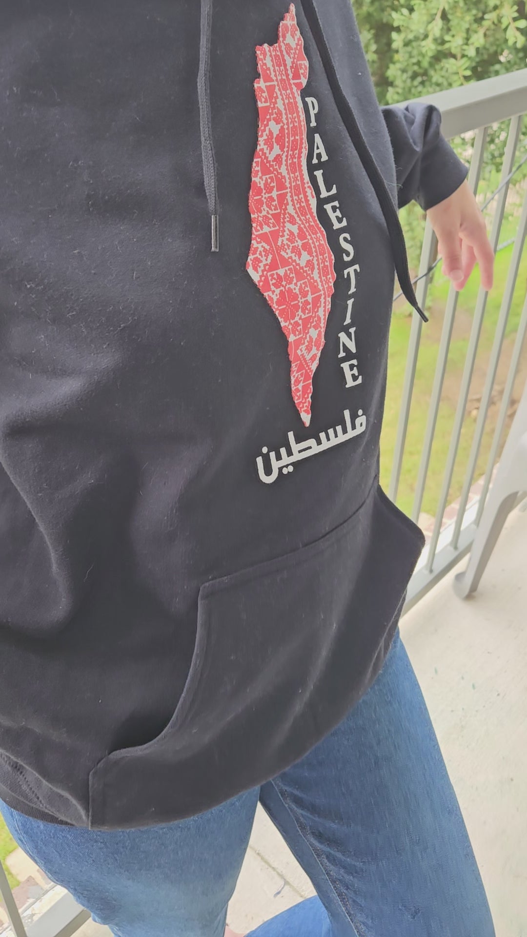 Celebrate culture and heritage with this bold and artistic hoodie. The shape of Palestine is filled with a traditional Tatreez design, beautifully symbolizing the richness of Palestinian embroidery. The word "Palestine" is prominently displayed in both English and Arabic, adding a meaningful touch to this unique design.