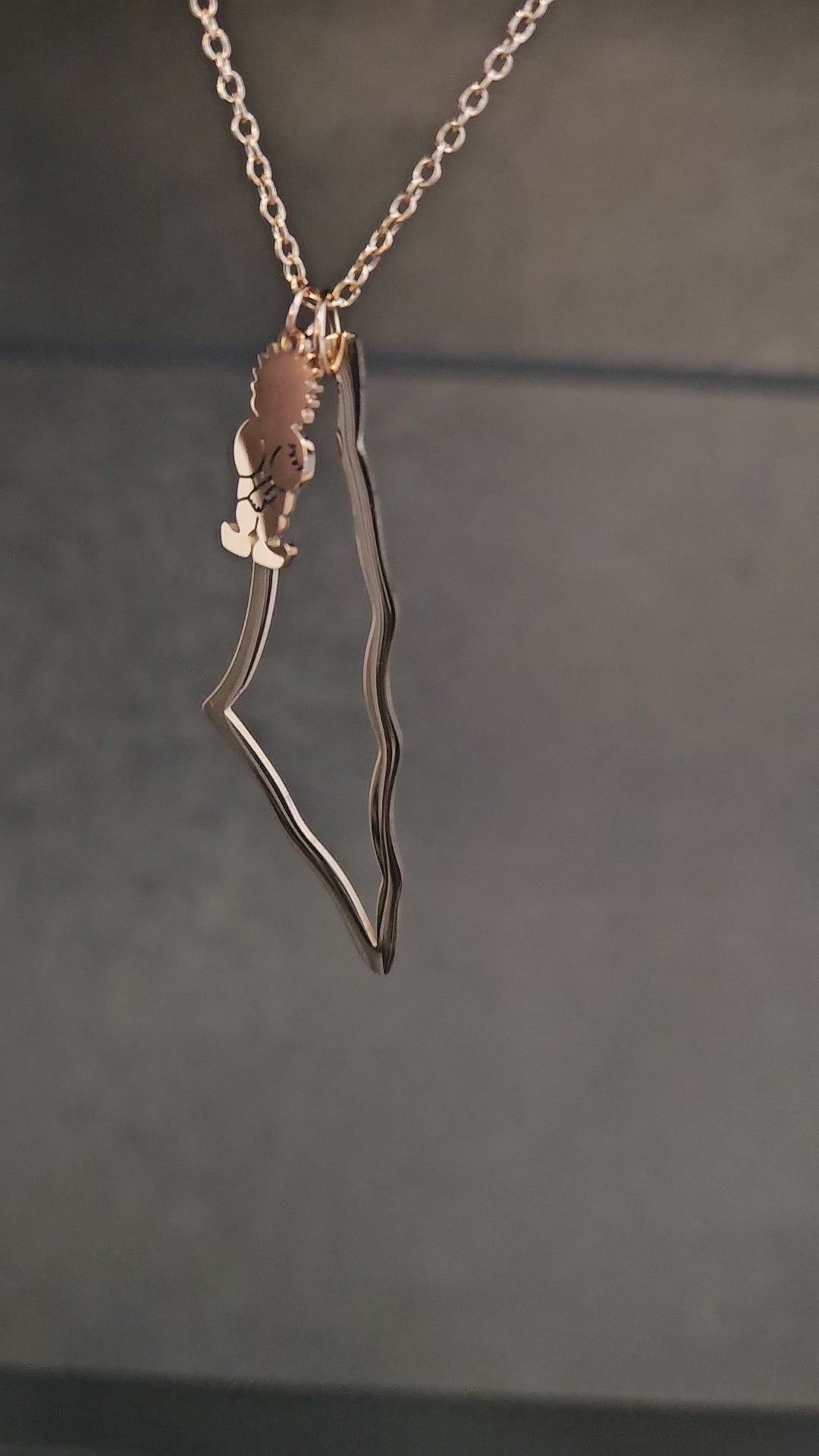 This Palestine with Handala Necklace is a stunning tribute to Palestinian culture and identity. Made with rose gold 18k gold plated stainless steel, the pendant features an outline of Palestine and a charming handala charm. Measuring 4cm, the pendant hangs on a 45cm necklace for a beautiful, subtle statement piece.